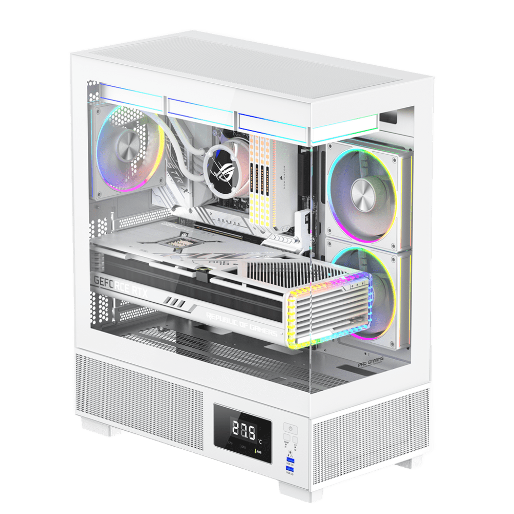 Acest PC Gaming Kian Alb Ice Ryzen 7-5800X pana la 4.7GHz, 32GB DDR4, 2TB SSD, RTX5060 8GB GDDR7, Windows 11, Wi-Fi 6 este construit pentru gaming modern si multitasking, oferind un echilibru excelent intre performanta, racire si design. Carcasa Kian Alb este echipata cu 6 ventilatoare ARGB incluse, controlate prin controller si telecomanda, pentru airflow optim si un aspect spectaculos. Procesorul AMD Ryzen 7-5800X, cu frecventa boost de pana la 4.7GHz, impreuna cu memoria 32GB DDR4, ofera rulare fluida in jocuri si aplicatii solicitante. Placa video NVIDIA GeForce RTX5060 8GB GDDR7 asigura performanta grafica ridicata si o experienta vizuala moderna. Sistemul foloseste IcePulse360, adica racire pe lichid AIO cu display digital pentru afisarea temperaturii, pentru temperaturi stabile si functionare eficienta. Placa de baza B55M K ofera stabilitate si compatibilitate buna, iar stocarea pe 2TB SSD asigura incarcare rapida si raspuns excelent. Sursa 750W 80+ Bronze garanteaza alimentare stabila si eficienta. Windows 11 este preinstalat, iar Wi-Fi 6 este inclus pentru conectivitate moderna.