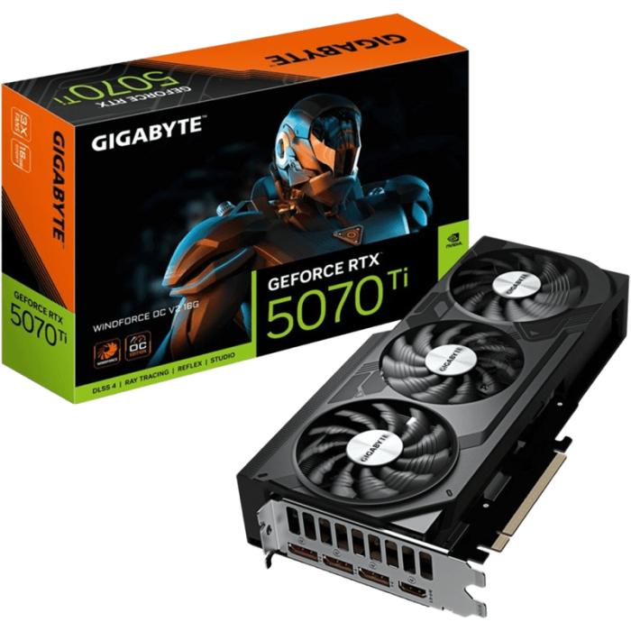 GIGABYTE GeForce RTX 5070 Ti WINDFORCE OC V2 16GB GDDR7 este o placă video de top din seria GeForce RTX 5000, bazată pe arhitectura NVIDIA Blackwell, destinată gamingului high-end, creației de conținut și aplicațiilor AI Ready. Cu 8960 CUDA Cores, frecvențe de până la 2497 MHz Boost Clock și memorie 16GB GDDR7 pe 256-bit, aceasta oferă performanțe excelente în jocuri moderne și aplicații solicitante.